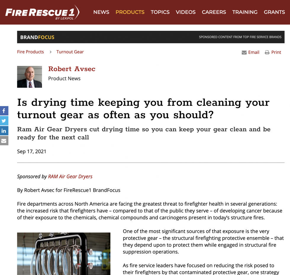 "Dirty gear is no longer a badge of honor. Having a fast and effective way to put gear back into service is the new standard... the (Ram Air) TG-4H can dry turnout gear in two hours or less."